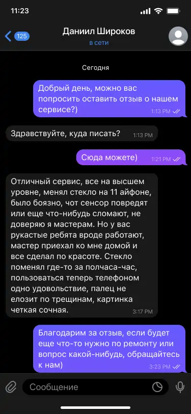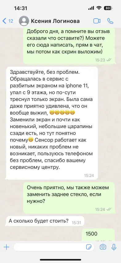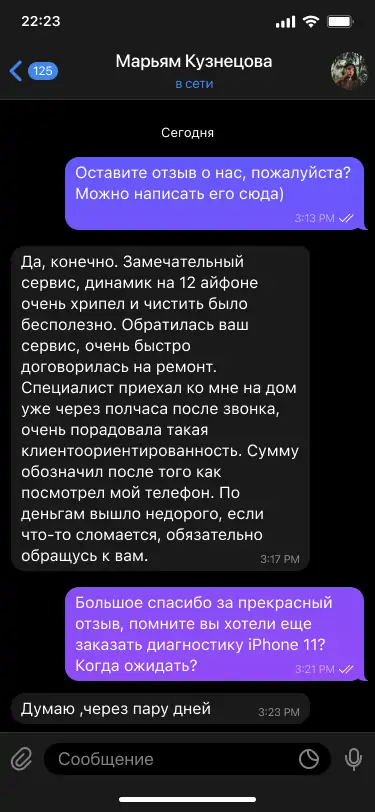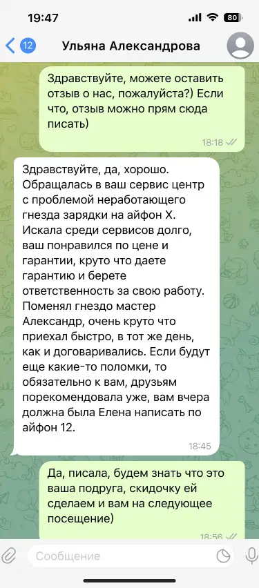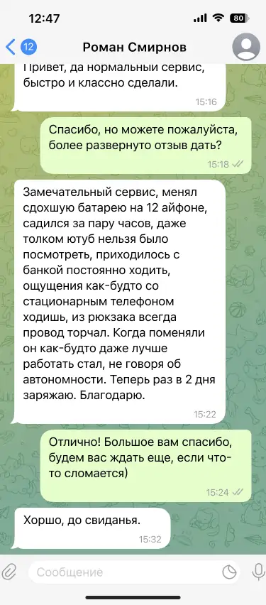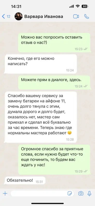 Сломалась зарядка, а у меня маленький ребёнок, вообще некогда бегать по сервисам. Очень выручили, приехали вечером, когда муж уже был дома. Всё сделали быстро, даже мусор за собой убрали. Мастер был вежливый, не навязывал никаких лишних услуг, что приятно удивило. Цена нормальная, результатом довольна. Если что-то ещё случится, буду обращаться снова.