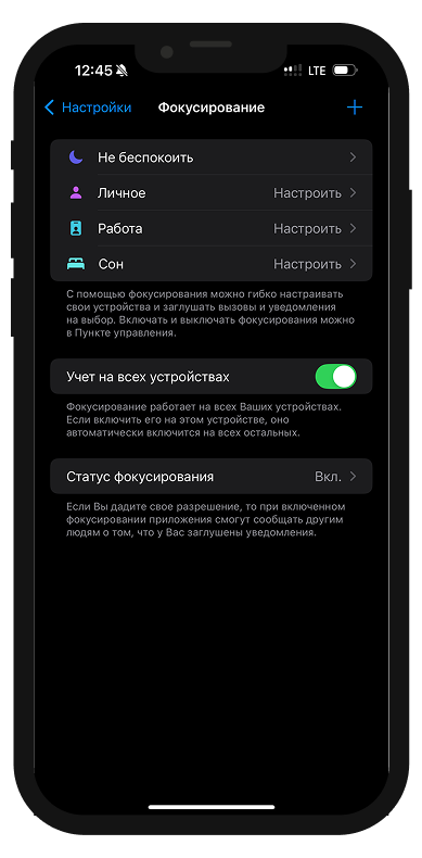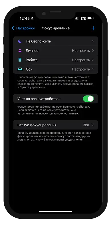 Отключение режима «Не беспокоить» и фокусирования