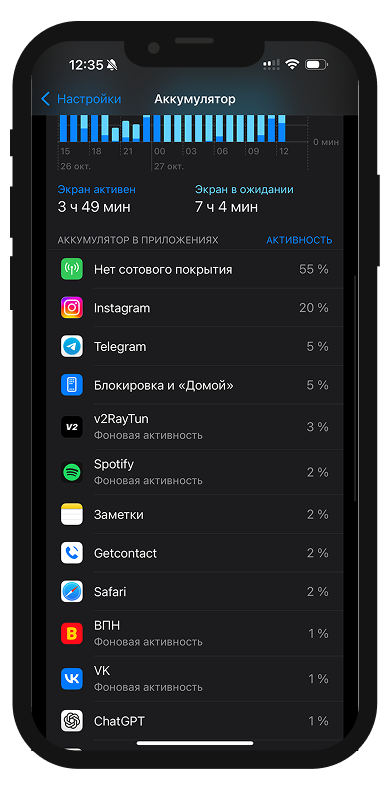 - Посмотрите, какие приложения потребляют заряд больше остальных.